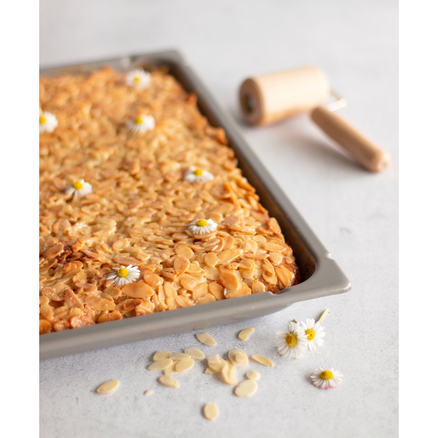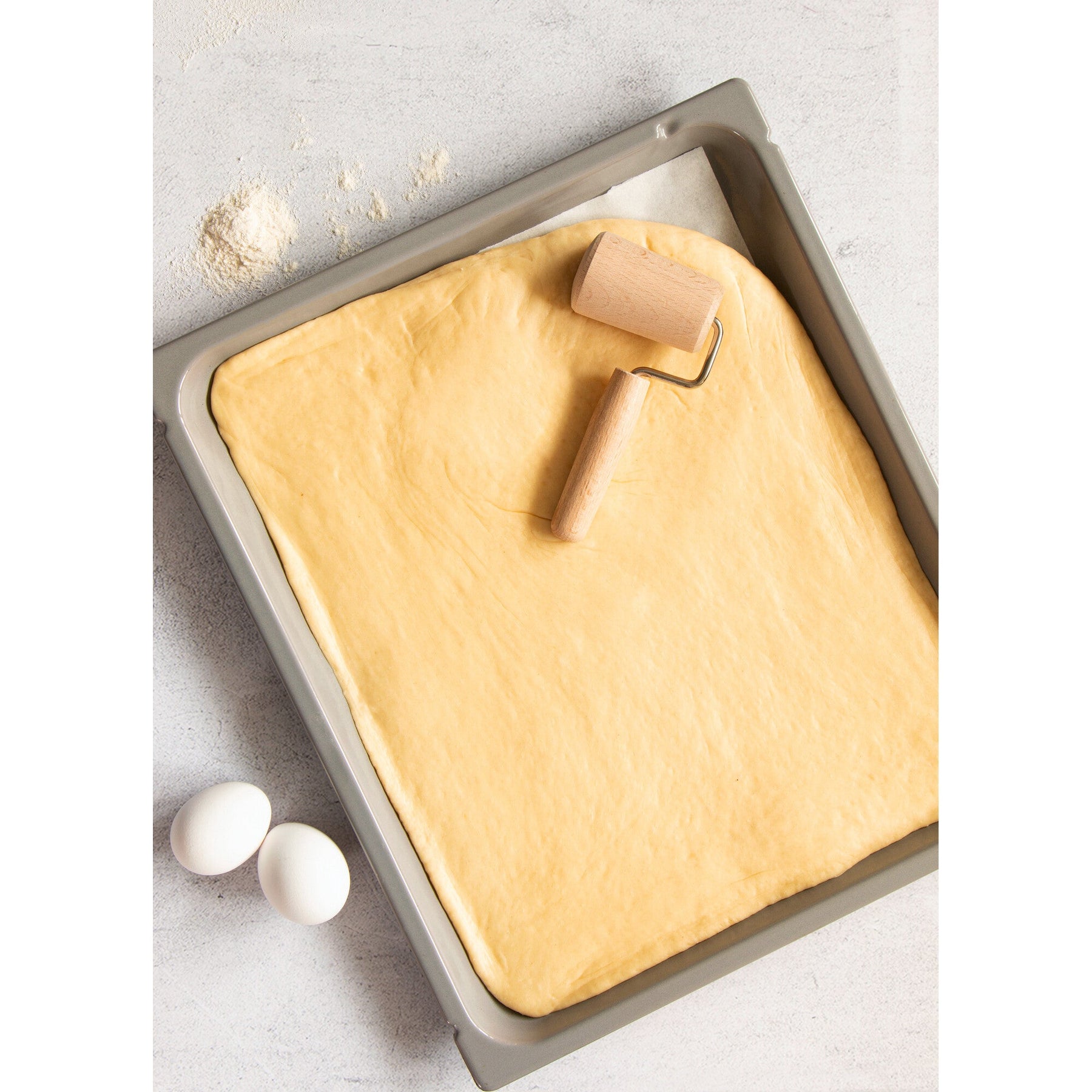 Denne bageplade rulle er især god til den nøjagtige rullende ud af dejen på bageplader, da den kan rulle ind i hjørnerne netop langs kanterne.