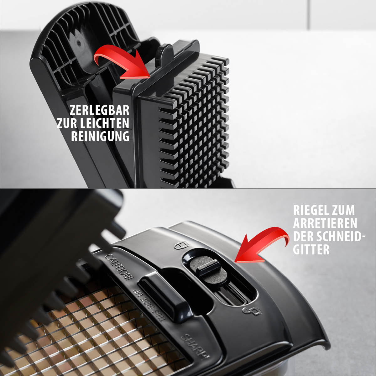 - 2 austausch- und arretierbare Schneidgitter für feine (7 x 7 mm) und grobe (13 x 13 mm) Stifte oder Würfel