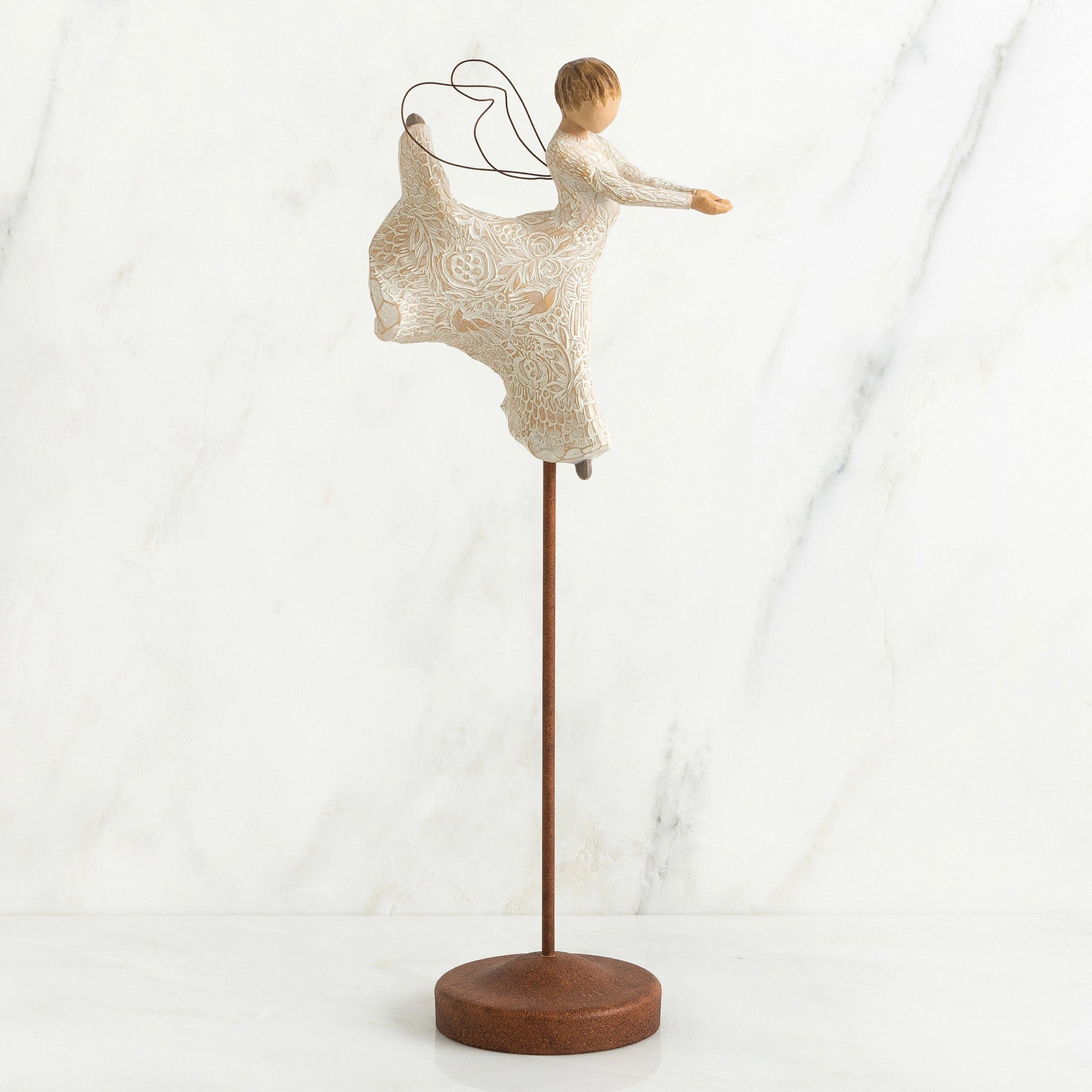 Willow Tree is a series of figurative sculptures that convey healing, comfort, protection and inspiration in a silent way. Artist Susan Lordi carves each original sculpture of Willow Tree by hand. This piece was cast according to her original carving and then painted by hand. The figure shows an angel with hands raised to his mouth, made of resin and painted with lead-free paint. The carvings on this piece symbolize fertility and procreation. Pomegranates and birds, intertwined with vines and berries, represent wealth and renewal of life. The product comes in a branded gift box with a parchment insert that includes a signed note from Susan Lordi and a gift tag that reads "Dancing... Whirl! The Magical Miracle of Life" on which you can leave your personal message.